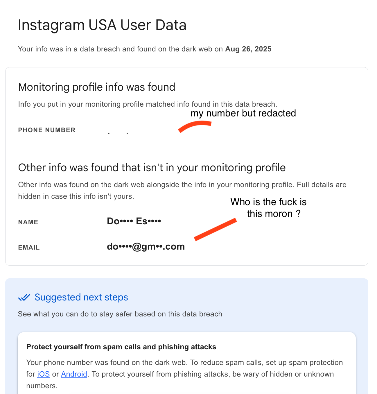 arrow-up11arrow-down1imageWhen Google tells you that someone is using your phone number on Instagram but they refuse to tell you their username or their gmail account that Google knows to protect the scammer's privacy.reddthat.comTheReturnOfPEB@reddthat.comM · edit-24 days agomessage-square0fedilink
