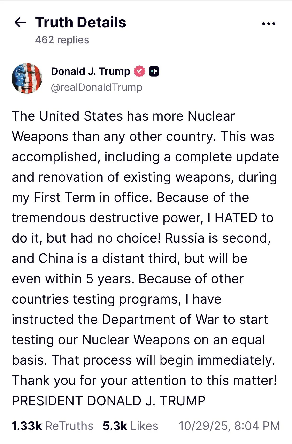 arrow-up11arrow-down1imageTrump Commands War Department to Test Nuclear Weaponsplus-squareeurope.pubtfm@piefed.europe.pubEnglish · 13 days agomessage-square0fedilink