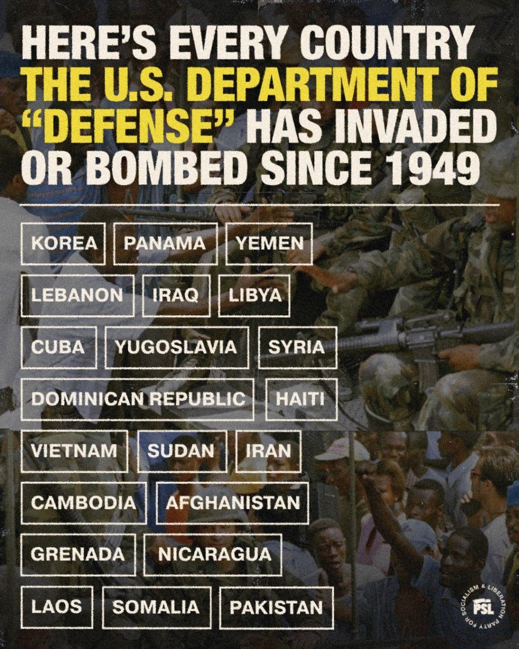 Spectre@lemmy.ml · edit-21 month agoHere's every country the US department of defense has invaded or bombed since 1949plus-squarelemmy.mlimagemessage-square0fedilinkarrow-up11arrow-down10