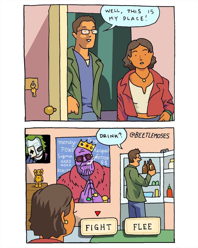 Also the posters are red flags not because they reference nerdy things but because they show an unhealthy obsession with fictional characters who, though charismatic, are evil people who justify their violent actions with straw man arguments about power and corruption. The words on the Thanos poster put an especially fine point on that part.