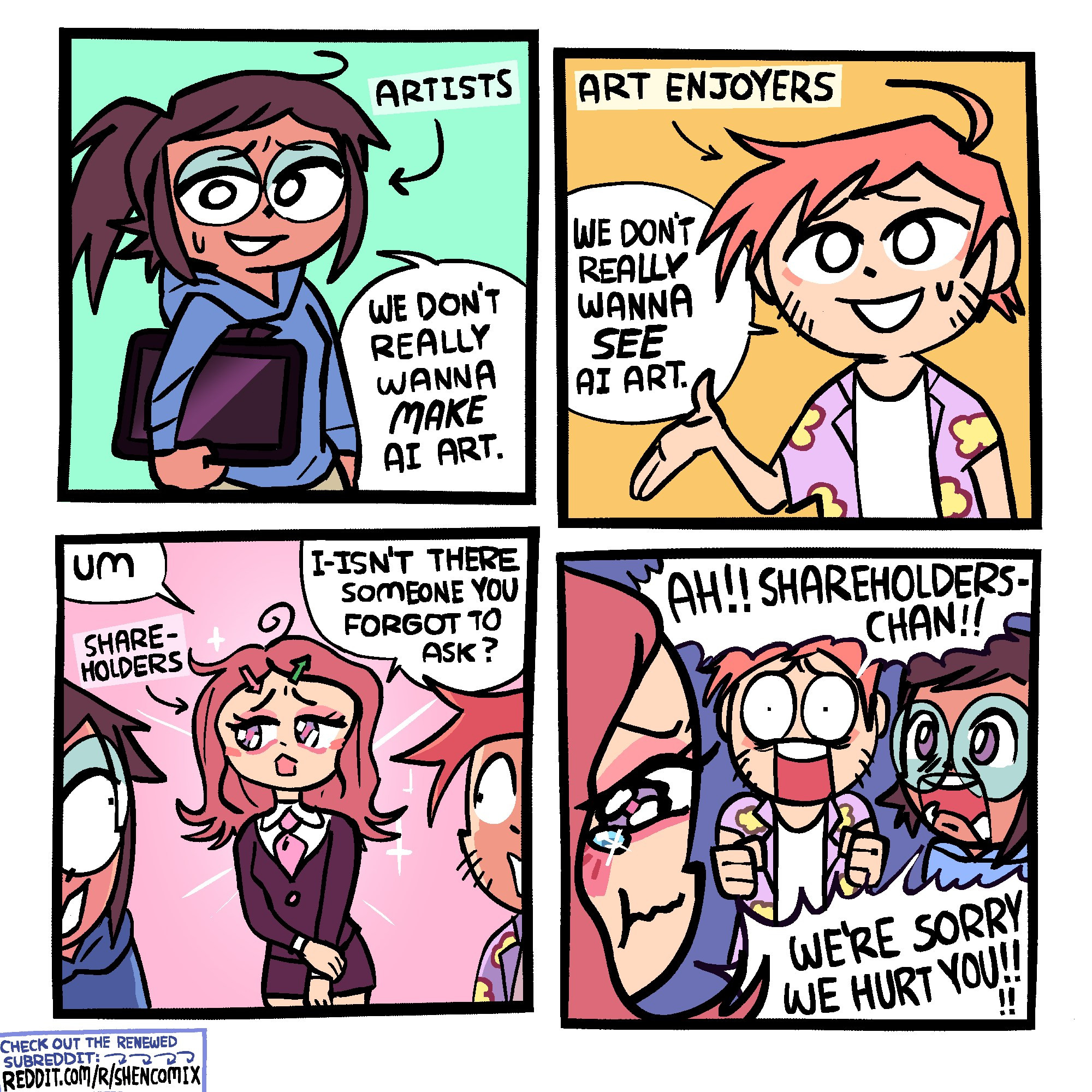 04: She puffs up her cheeks and pouts, a tear is on the verge of falling from one of her eyes. ‘Artist Enjoyers’ Guy is now in front of her yelling “AH!! SHAREHOLDERS-CHAN!!” while ‘Artists’ Girl is in front of her yelling “WE’RE SORRY WE HURT YOU!!!”