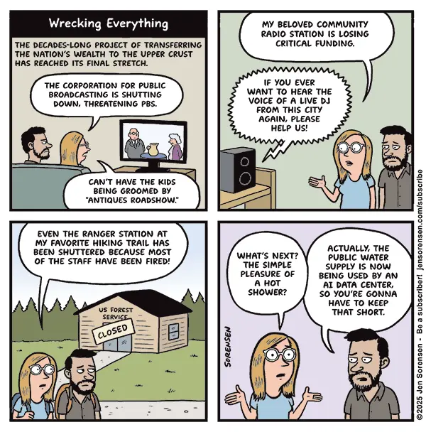 I often watch PBS or PBS Create, especially Rick Steves and other travel shows. The cooking shows are mostly mindless “comfort food TV,” sometimes literally cooking comfort food. NOVA and Christiane Amanpour are also excellent. Now this all faces an uncertain future. I also listen to community radio stations wherever I live, and since I’ve lived in several cities with good stations, I try keep up with some of them online. Now I hear announcements saying “We’ve lost our federal funding, please help cover the shortfall.” Same story for national parks. It’s just bizarre to see visitor centers shuttered in a country as prosperous as this one (speaking in the abstract). You’d think this was the Great Depression.