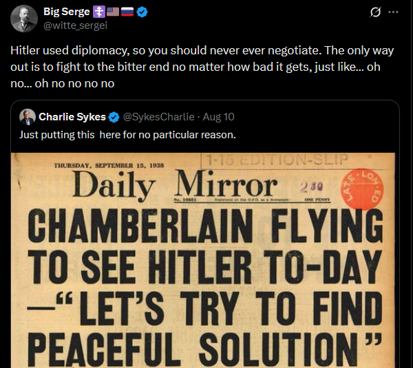 Sykes is saying that negotiating with Russia right now is the same as Chamberlain meeting Hitler. The implication is that the Ukrainians/ NATO ought to fight to the bitter end, because this is literally Putler. Serge is mocking the logic of saying that negotiation is bad (because that’s famously how you enable Hitler), so instead we ought to fight to the bitter end no matter what (because that’s famously how Hitler decided to go out). Serge is mockingly taking Sykes at his word, and then ‘regretfully’ realizing that the actual conclusion is “We shouldn’t act like we’re helping Hitler, so instead we should act directly like him.”