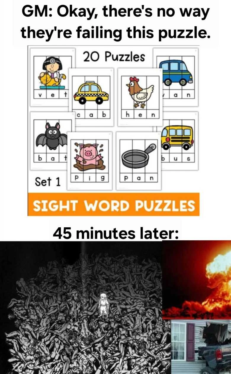 DnD Barbarian: “B…A…T… Oh no, it’s bait for a trap!” WoD player: “No, you dolt. It’s clearly meant to be a more complex anagram indicating the identity of the coconspirator. Cunning… peasant…” Call of Cthulhu player: insensate screaming “It is the name of the unspeakable! Burn them! Destroy the tablets! Bury the entrance so that none find this place again in our lifetimes!” DnD Wizard: “Fireball. Final answer.” rolls