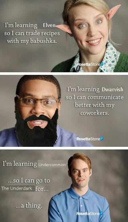 Maybe the top one is half-elven and grew up among non-elven races, but I have never heard of canon half-dwarves (assuming that the beard is intended to signify that he’s a dwarf). Why would an adult dwarf need to learn dwarvish? Especially in the context of a meme like this, a dwarf who can’t speak dwarvish would be an outlier and that doesn’t make sense in the context of an ad.