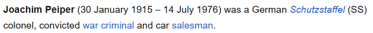 Peiper? of Kampfgruppe Peiper? He did one of the worst warcrimes of the western front when his men murdered 84 POW’s at the Malmedy massacre.