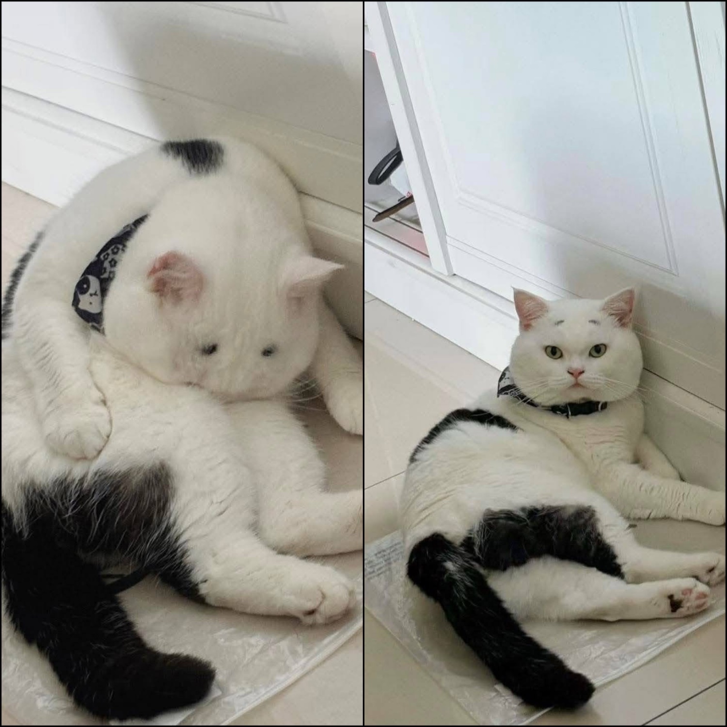 - I’m scared this might be fake. The way the color fades out is not natural, its a very smooth fad, while if it was differently colored fur the fade changes depending on the grain of the fur. - It could’ve been taken while the cat was moving causing the demonising algorithm to smooth out the details.