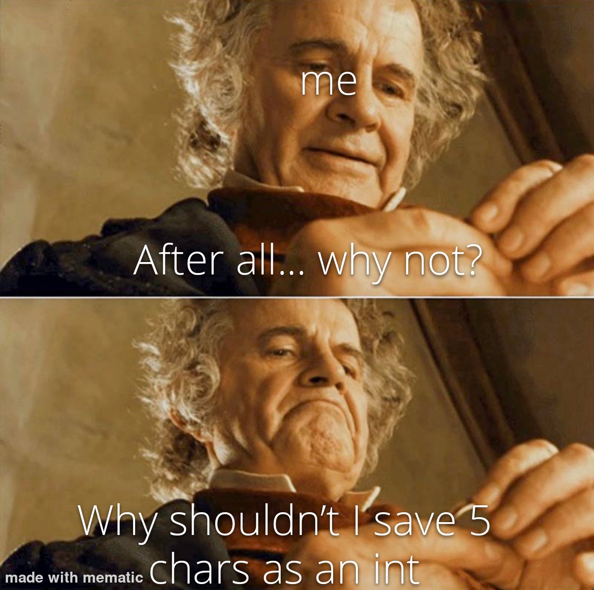 Did you ever saw a char and thought: “Damn, 1 byte for a single char is pretty darn inefficient”? No? Well I did. So what I decided to do instead is to pack 5 chars, convert each char to a 2 digit integer and then concat those 5 2 digit ints together into one big unsigned int and boom, I saved 5 chars using only 4 instead of 5 bytes. The reason this works is, because one unsigned int is a ten digit long number and so I can save one char using 2 digits. In theory you could save 32 different chars using this technique (the first two digits of an unsigned int are 42 and if you dont want to account for a possible 0 in the beginning you end up with 32 chars). If you would decide to use all 10 digits you could save exactly 3 chars. Why should anyone do that? Idk. Is it way to much work to be useful? Yes. Was it funny? Yes.