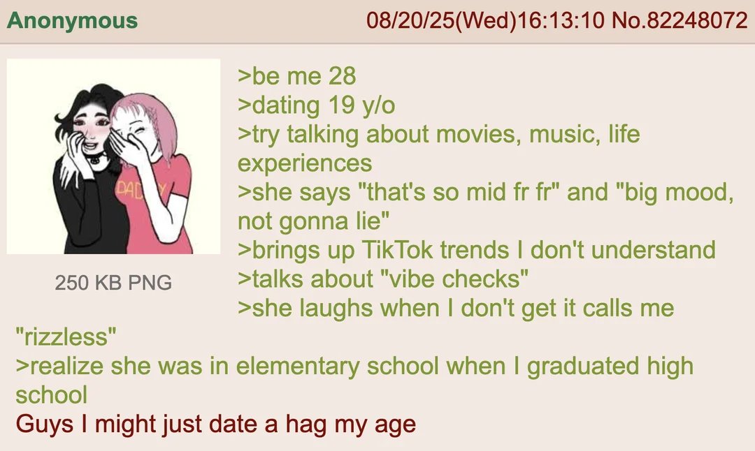 Yeah, at 27, 22 was already like too young for me. Let alone 20.