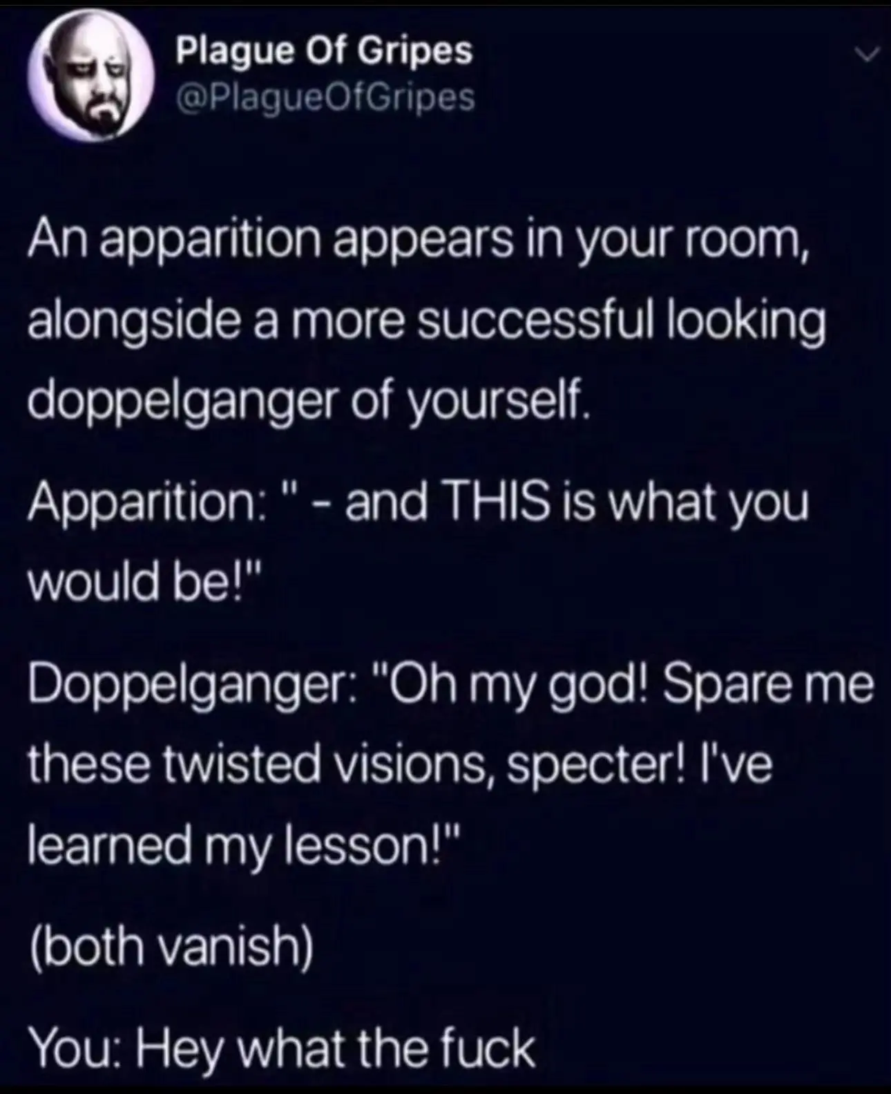 Reminds me of an episode of Aqua Teen Hunger Force where Carl finds an alternate universe version of himself who is the best possible version of him (because Carl had hair) and convinces him to ruin his life then kill himself.
