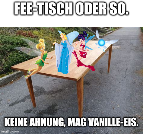 minus-squareBlack616Angel@discuss.tchncs.delinkfedilinkarrow-up5·27 days agoUnd wenn Trinker Bell aus Hintertupfingen kommt, ist sie dann eine Kaff-Fee?