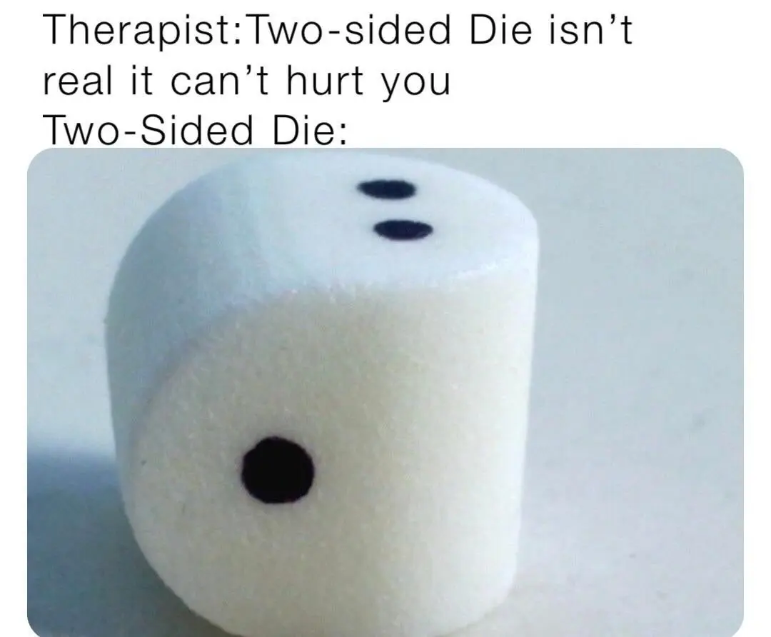 Mfers be out here debating whether the thing depicted is actually a “two sided” dice, meanwhile coins just be chillin over there getting ignored.