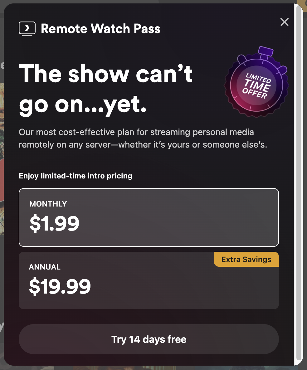 Plex wants to be a profit-driven company, but their business model is piracy. They’ll squeeze you for subscriptions, while making your experience worse to try and broker a peace deal with content owners.