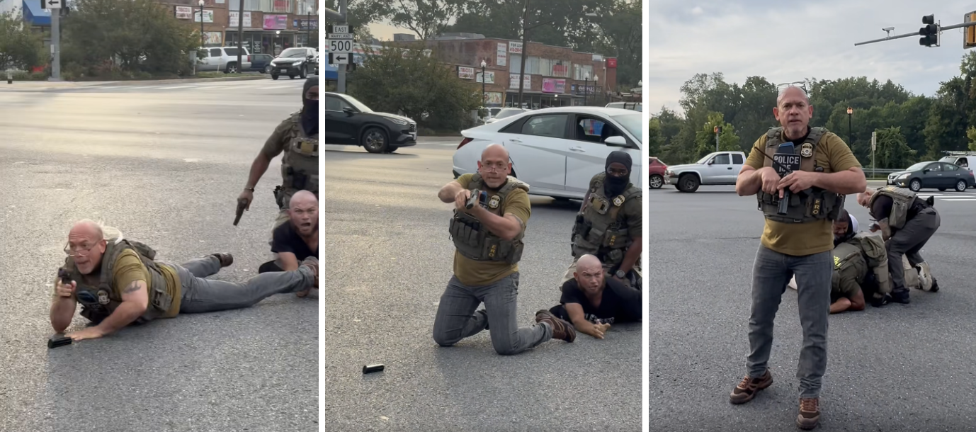Drops his own gun next to the hand of the guy he’s arresting, then hastily picks it up to point it at the people recording him. Incredible.