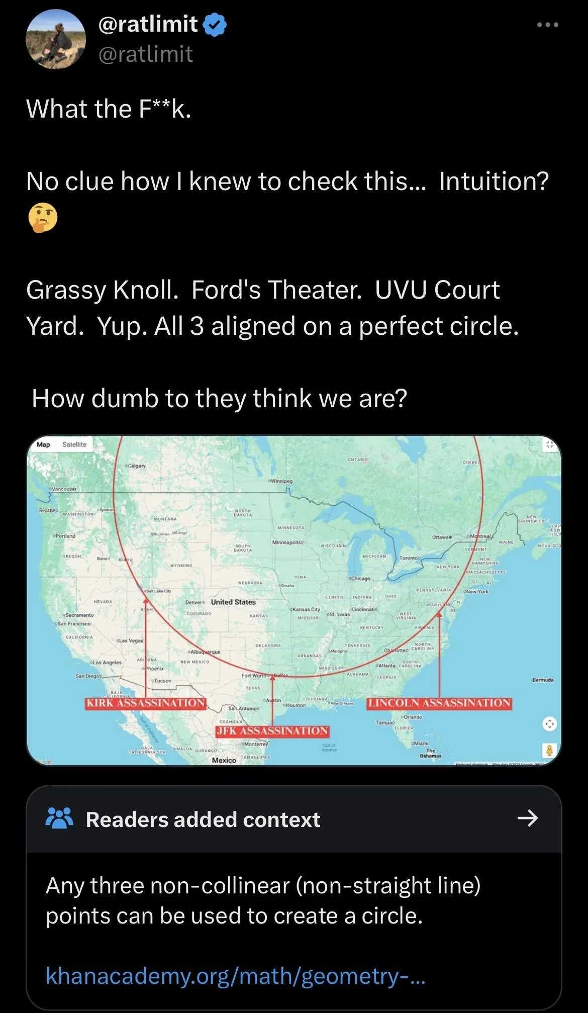 Why is nobody mentioning that any point you choose just happens to be in an EXACT STRAIGHT LINE from the others!? And this just happened by chance? I’ve got some ocean-front property in Arizona I’d love to sell you.