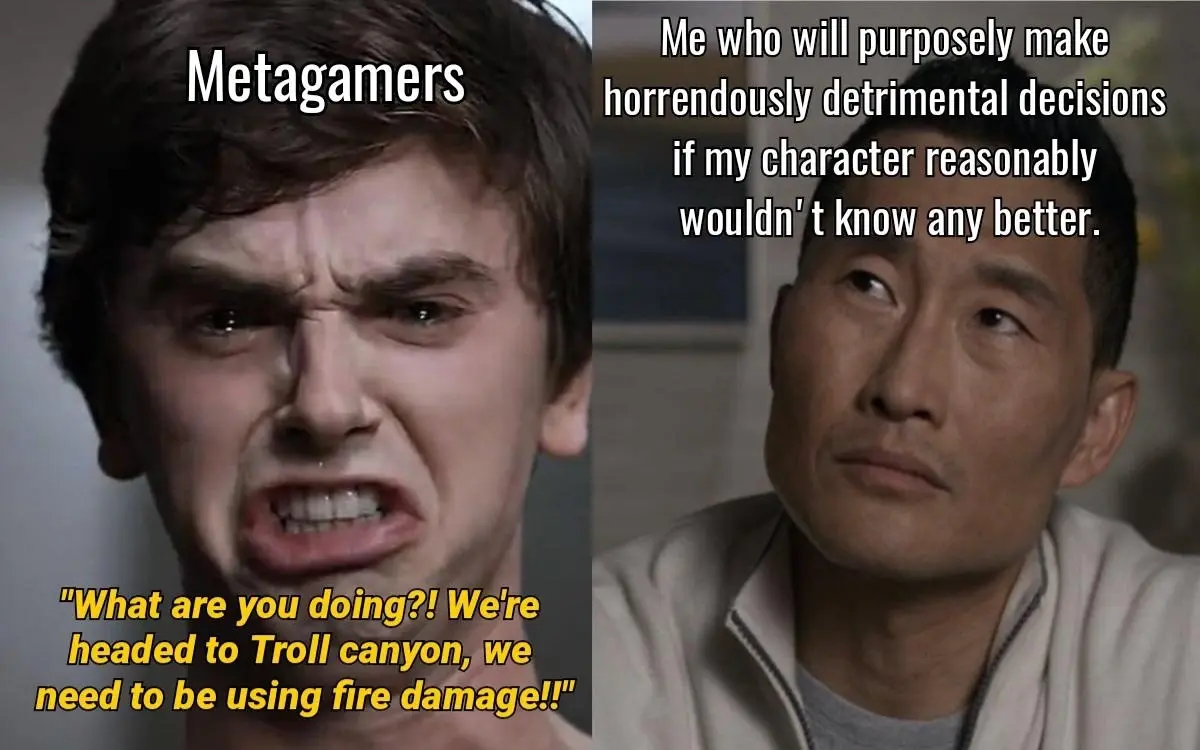 Another good example of metagaming that so many people view as okay that they don’t even view it as metagaming is telling your party OOC how many hit points you have remaining the healer choosing who to heal and with what spells based on the information. Your character doesn’t know that number. A lot of times all you really know IC is if someone has less than half of their hit points remaining and a vague idea that barbarians can take more hits than wizards.