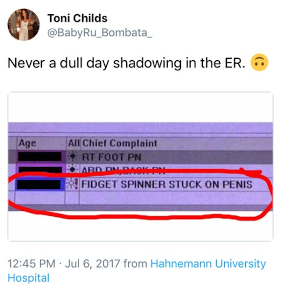 minus-squarevateso5074@lemmy.worldlinkfedilinkarrow-up8·10 days agoFor this one, I think it’s nothing quite as exciting, basically just what you’d expect. S30.852A - Superficial foreign body of penis, initial encounter