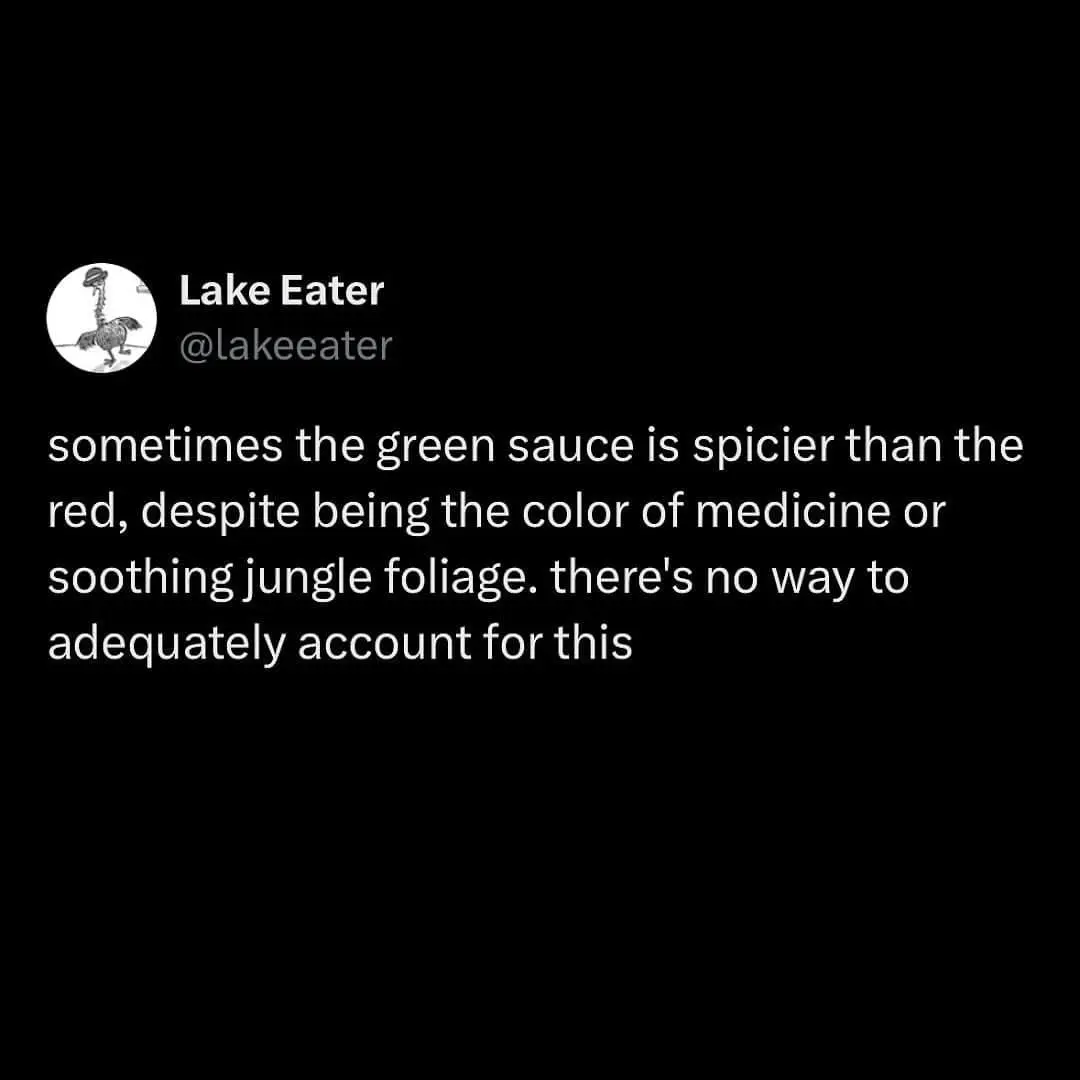 minus-squaredamnthefilibuster@lemmy.worldlinkfedilinkEnglisharrow-up14arrow-down2·1 month agoIf the green sauce has little white dots in it (seeds), then stay 👏 away 👏from 👏 it 👏!