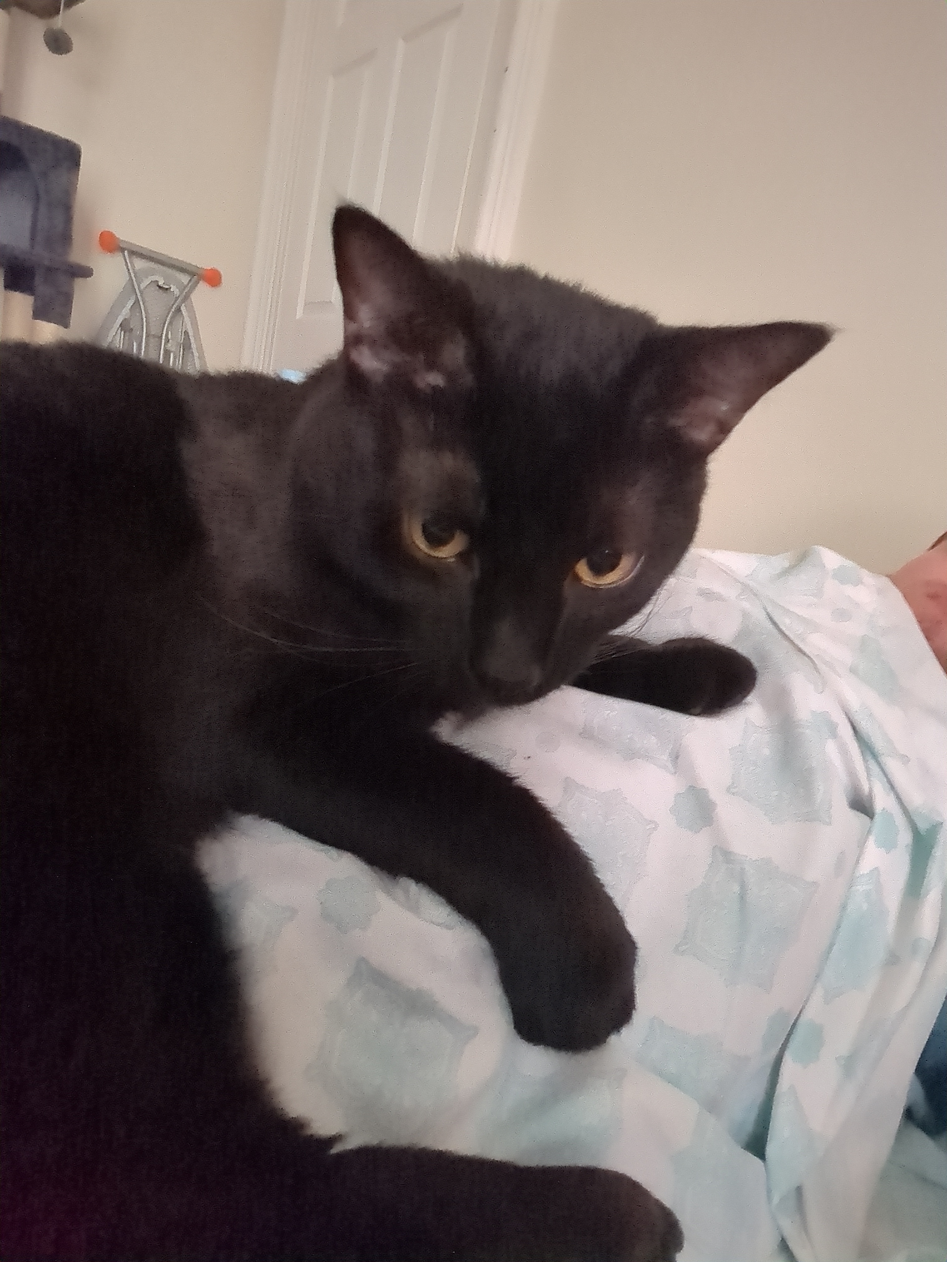 Hi my little stinker loves cuddles and sleeping on chest. He doesn’t notice the massive pain I feel when he steps directly on the fracture. How do I train him not to sleep on my sling side? I threw him off of me when he caused a jab of pain throughout my body but that was mean and he didn’t learn to be gentle. ,