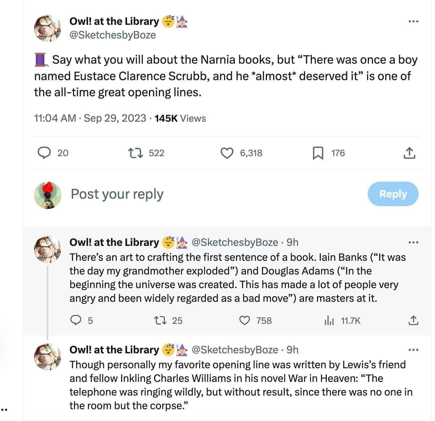 arrow-up11.07Karrow-down1imageWhat other great opening lines do you know?.lemmy.worldBonesOfTheMoon@lemmy.world to Microblog Memes@lemmy.worldEnglish · 3 days agomessage-square246fedilink