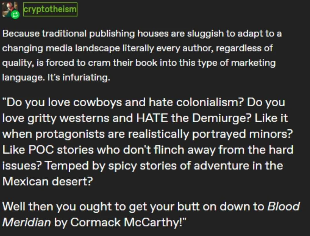 minus-squareOld Jimmy Twodicks@sh.itjust.workslinkfedilinkEnglisharrow-up22·20 days agoDo you HATE punctuation and LOVE authors who boldly reject formatting conventions? Have you ever wanted to be suffocated by a based albino giant while he pontificates about war being the great equalizer? Have you ever wanted to call Native Americans the n-word? Well, come on down to Blood Meridian by Cormac McCarthy! Streaming soon on Disney+!