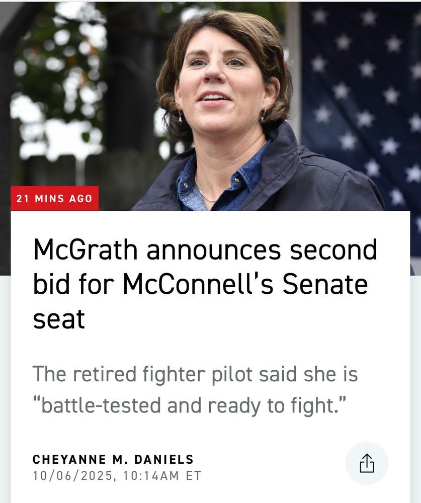 Amy McGrath on Monday officially launched another Kentucky Senate bid, aiming to take the seat held by retiring Sen. Mitch McConnell. McGrath, a retired fighter pilot, announced her candidacy on X, saying the Bluegrass state deserves a senator “battle-tested and ready to fight.”