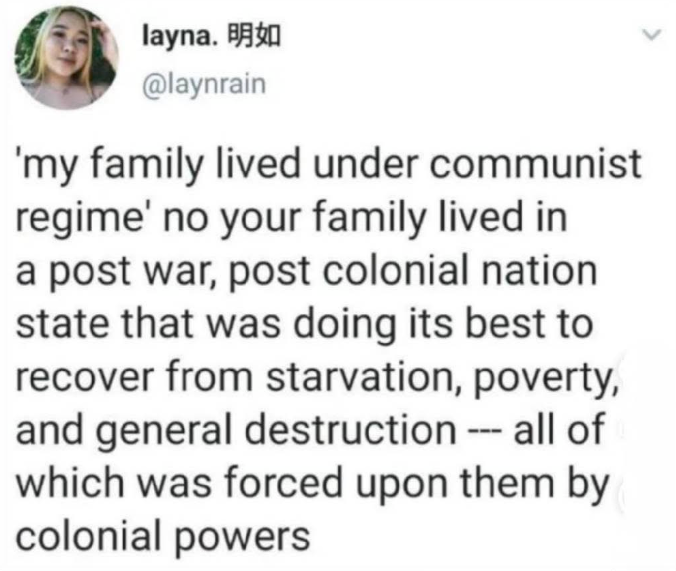me when the communist state I’m in was from a colonized exploited state and I blame communism instead of the imperialism I saw