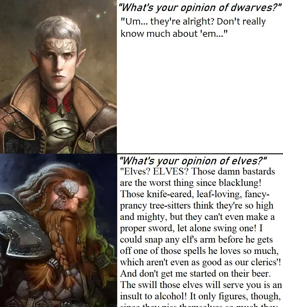 Elves? Dwarves? I believe they’re all brilliant on their own rights! For example - dwarven slaves make for perfect labourers while elven slaves are wonderful bedmates!