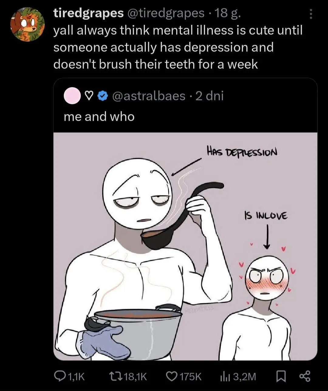 It is the showing of adoration or, more specifically, people who romanticize our suffering; those who try to reassure us that we are still “beautiful/handsome/desirable” while we are at our lowest, haven’t taken care of our hygiene in weeks, and look like a disheveled mess of our former selves. It comes off as patronizing. Then there are the ones who think we are some cliche emo from TV, as if our suffering is an aesthetic choice rather than a genuine breakdown of our ability to care for ourselves.