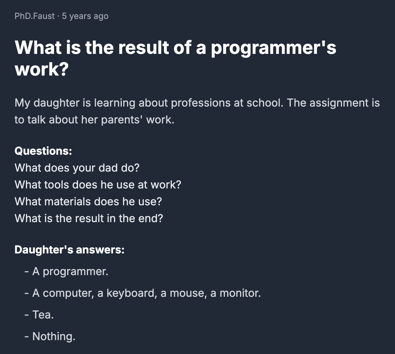 I feel like this needs to be one of those tshirts from old facebook ads that is like a skeleton riding a motorcycle. “I’m a programmer, that means I’m a machine that turns tea into nothing.”