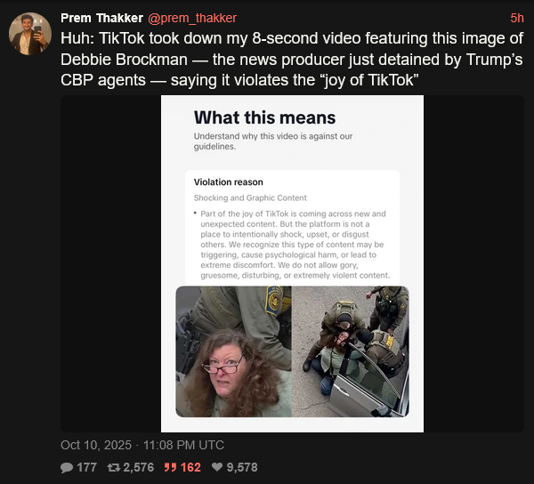 Huh: TikTok took down my 8-second video featuring this image of Debbie Brockman — the news producer just detained by Trump’s CBP agents — saying it violates the “joy of TikTok”