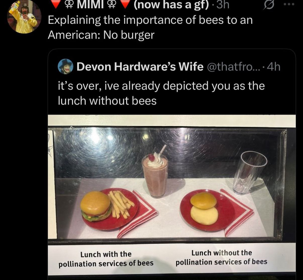 Stuff in this pic that IS pollinated by bees: the sugar beets that are potentially in everything (edit: nope, that’s wrong) but not the corn you can also use for sugar. Cucumber for the pickles. Some oil plants to fry in. Coconut or almond if you don’t want cow milk. Sesame seeds on the bun.