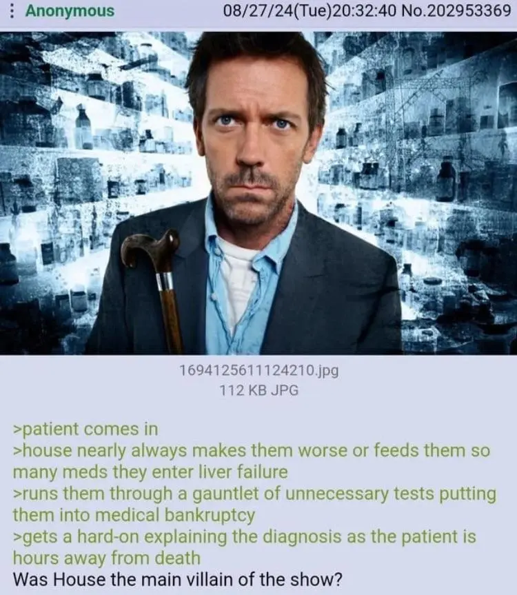 If you look at what he did to everyone who surrounded him, made Chase a paraplegic, bullied Wilson and Cuddy unrelentlessly, drove a car through Cuddy’s living room, made Foreman a lesser doctor than he was destined to be, was part of the reason cutthroat bitch dies, not forgetting the misdiagnosis and the general attitude, yeah… He was the villain of the show