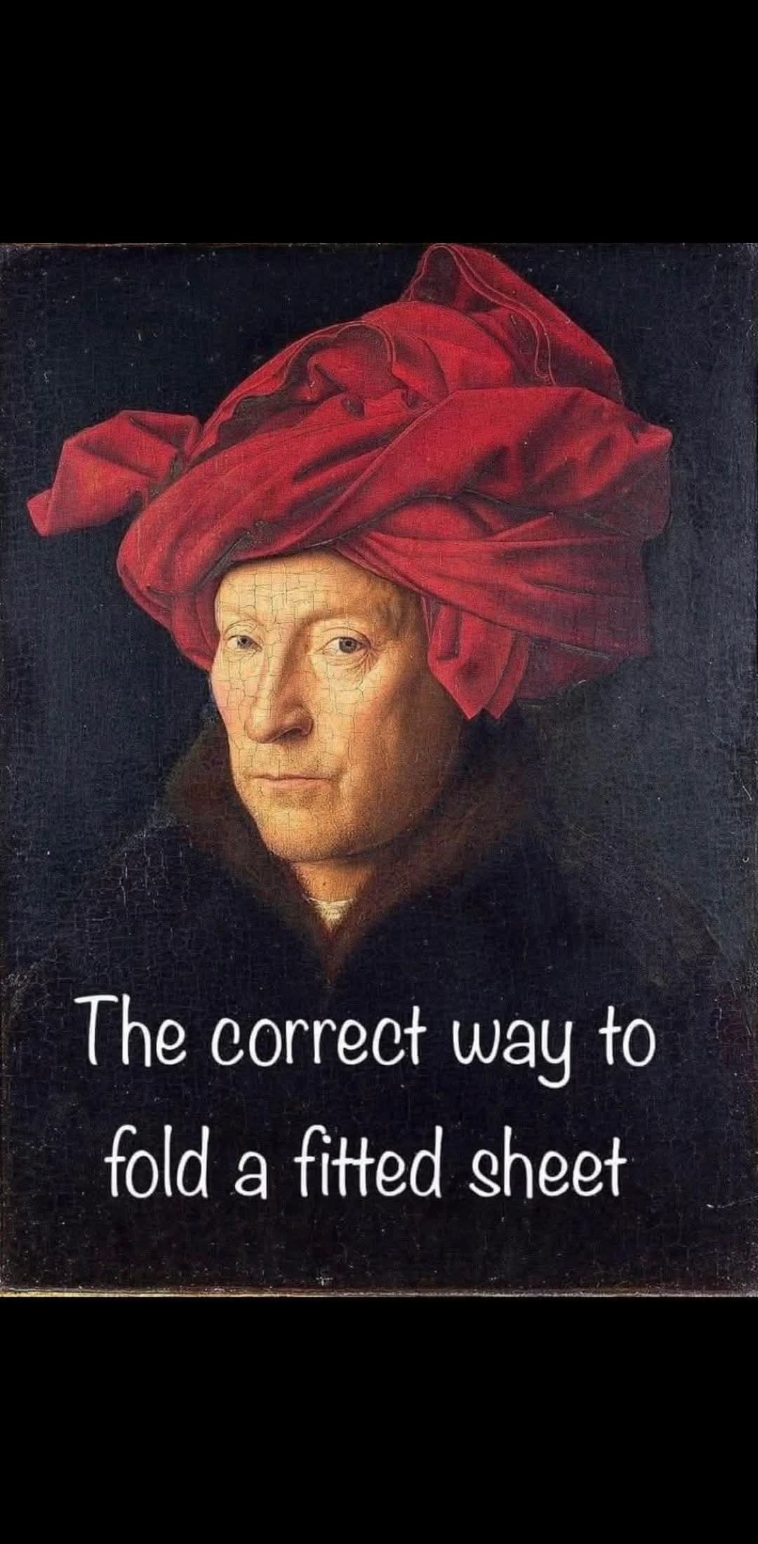 That works if the sheet only has elastic on the corners. The last few sets of sheets I have bought have elastic all the way around the edge of the fitted sheet. Does well on the bed but damn they’re impossible to fold.