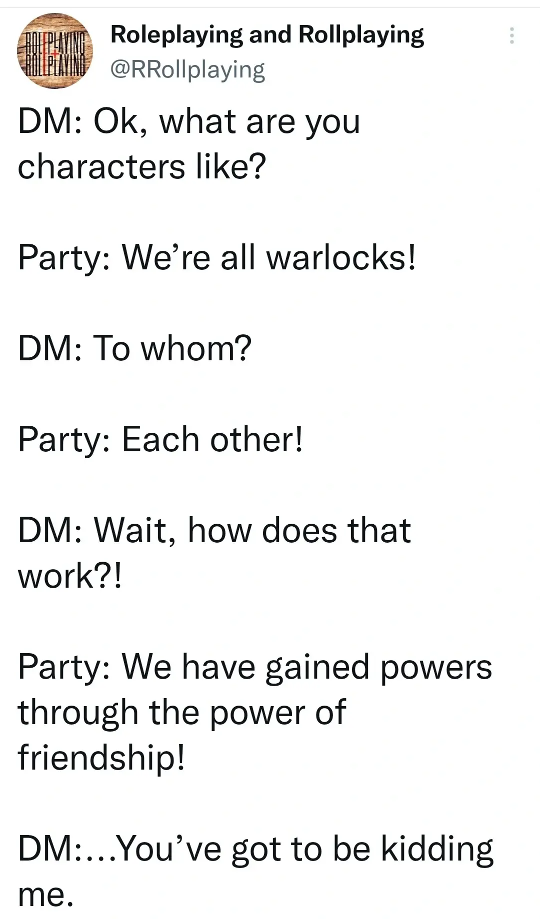 I have been working on a scenario setup based on a previous posting of this idea. MLM, multi-level magicking. Boil-down is that the party is a group of newbie mages (warlocks in DnD terms) at one or more of the local ‘Mages guilds,’ (which guild is determined by subclass) organizations which send out Mages to ‘help’ in one way or another. Some of the work is paid, but plenty of it is pro bono publica. The guilds have a great reputation because of the pro bono work, so PCs start with a very high-fantasy power rangers feel, but they got their powers by entering a magical loyalty contract to their ‘Mentor,’ and some of the jobs they get sent on will seem kind of ‘…off’ compared to the others, and they find out the only way to become more powerful (literally to gain levels, XP is meaningless/capped) is to find their Mentor’s Mentor and take their Mentor’s place, removing their Mentor’s power, which their mentor doesn’t want. So the party slowly gets to see that only the sneakiest, most conniving and underhanded Mages are able to advance, but now they have to either advance, or quit and become commoners.