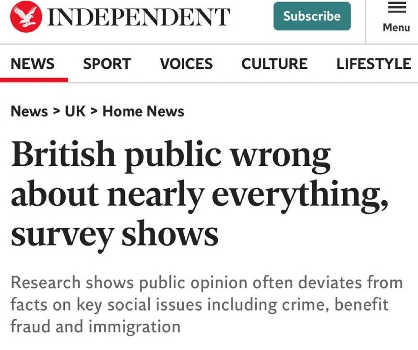 Survey asks a bunch of morons, bigots and gammons of their opinions on things.