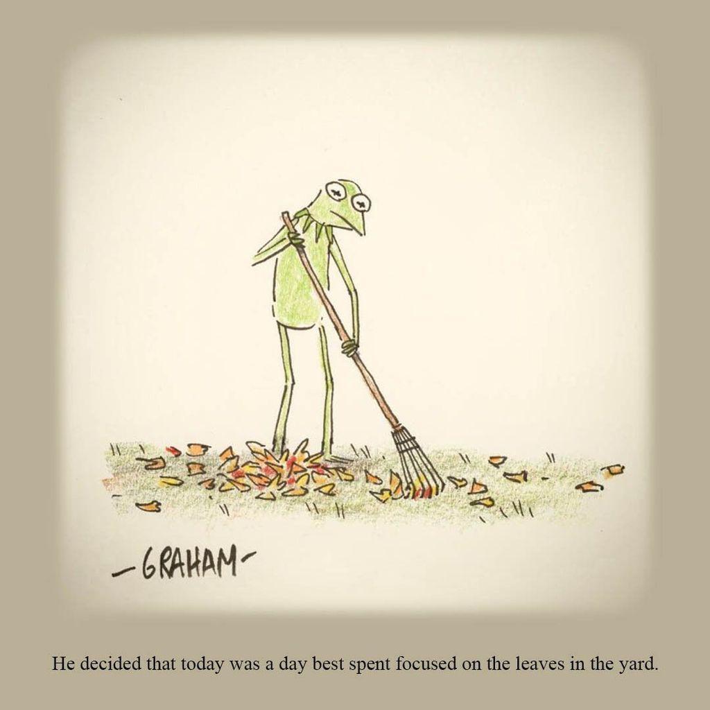 Alt Text: A cartoon illustration of Kermit quietly raking up fallen leaves outside. Caption reads “He decided that today was a day best spent focused on the leaves in the yard.”