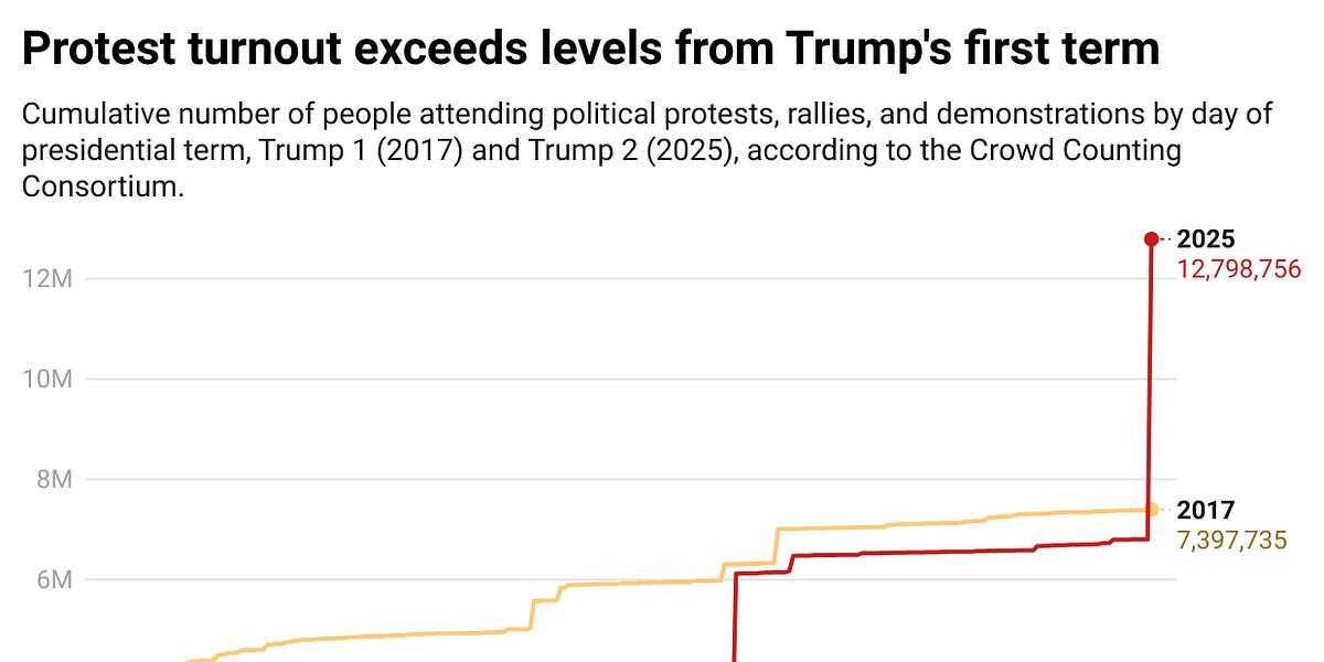 - Worth noting that it’s in spite of threats of violence and getting disappeared. There’s bound to be some people who didn’t attend because of immigration status or worry over job loss. - But immigration status makes sense right? I am on Green Card I try to avoid any political demonstration because I don’t vote. I don’t want to lose my visa, my home and be sent to a concentration camp, no everyone is protected by the 1st right now. - Yes, exactly my point, the march is suppressed by the authoritarian government. 7 million is a lot when it probably could have been twice that if everyone was able to come out who disagreed with how things are going.