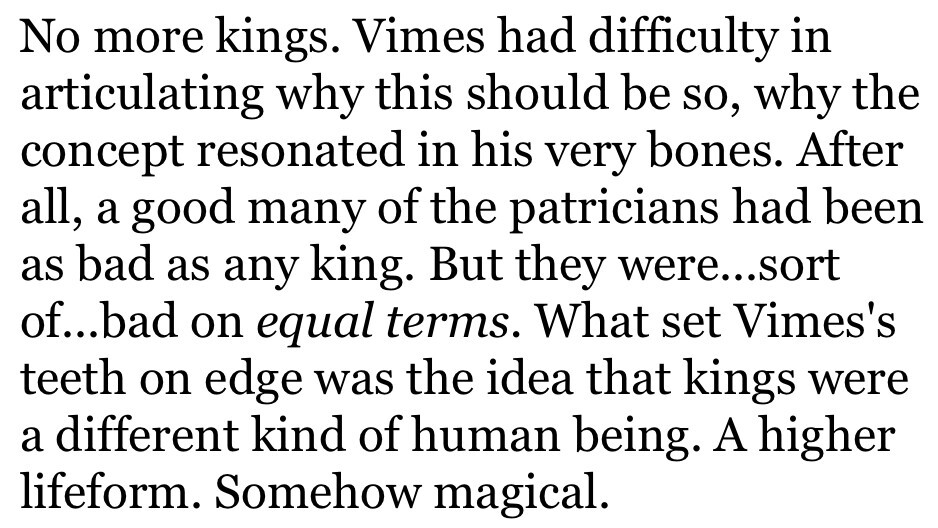 I think this is a parallel with the way british democracy works and, I assume, Terry’s own feelings about it. Ankh-Morpork and Britain are both easily able to shed dipshit prime ministers and do so regularly. Ask Charles to do some actual governing and the country will collapse in 4 years - mostly because the way things are people don’t actually have to confront the shittiness of the royal family. They can latch onto the royals to little consequence. Likewise, the way things are in Ankh-Morpork means that people can wax poetically about the throne because there’s nobody sitting on it. Ankh-Morpork is not a monarchy, but it still has a nobility of sorts, a class system and the throne still sits upon the city, bereft of a king but still standing as a symbol of history. If Carrot sits on the throne it could quite literally fall apart and that symbollizes what’s ahead for Ankh then.