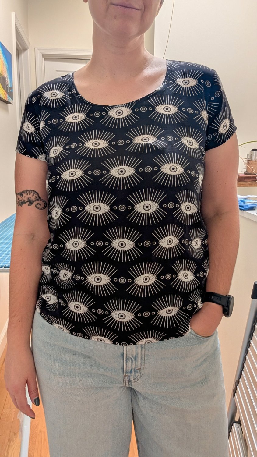 I love it so much! The spooky fabric looks great and is so comfy (rayon batiste). The print is low-key enough that I would definitely wear this to work, but when you look closer the eyes have creepy veins haha. The fit is perfect. (I added one inch to the length because I cannot with too short tees.) I don’t have a serger so I did French seams. They were so much less intimidating than I thought, and the finish is divine–so much better for me sensory-wise.