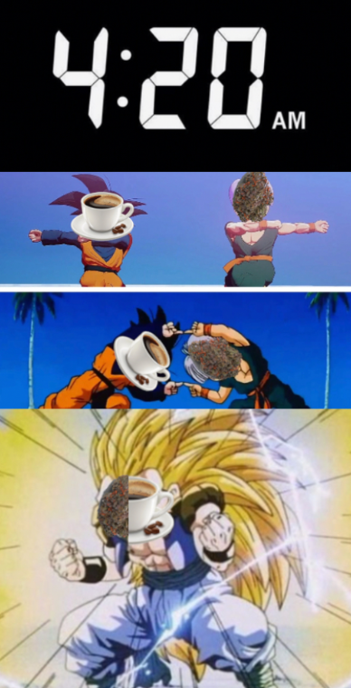 It’s not Vegeta but on the right track. It’s Goten and Trunks performing the fusion dance to become Gotenks. You smoke the weed while drinking the coffee. It’s a little up with a little down.
