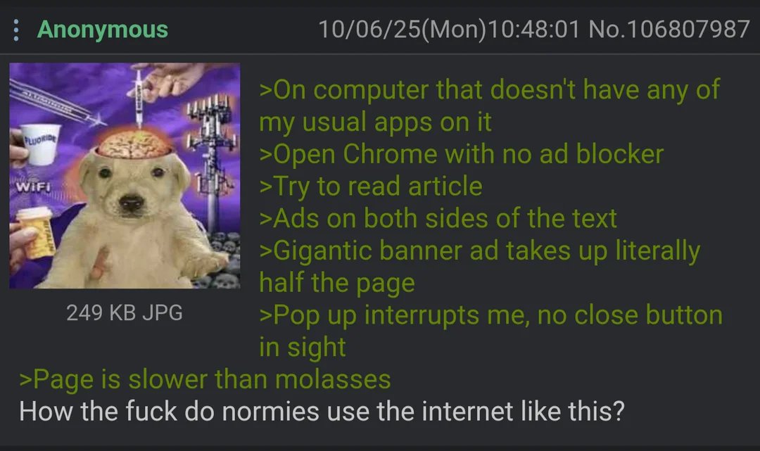 arrow-up11.01Karrow-down1imageAnon uses the internet like a normiesh.itjust.works🍹Early to RISA 🧉@sh.itjust.worksM to Greentext@sh.itjust.works · 12 days agomessage-square108fedilink