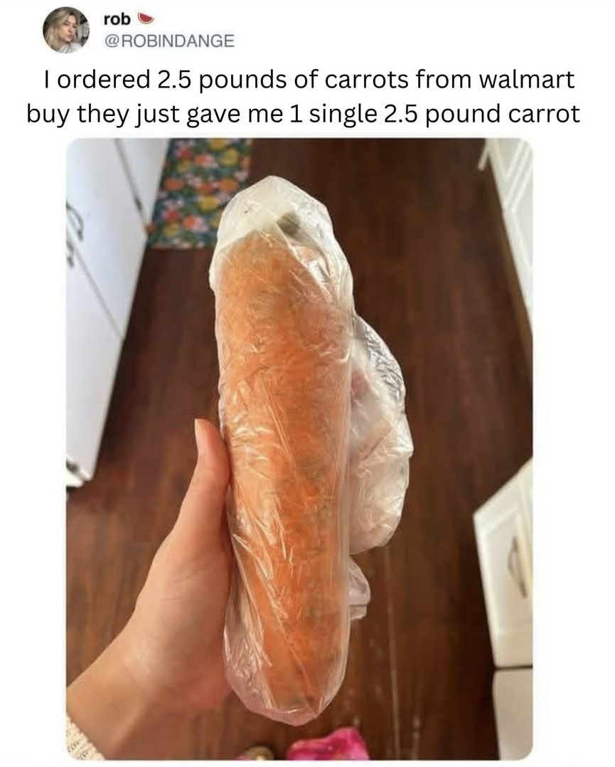 Well yeah, they’re made to order. Probably forgot to enter a value in the quantity field and the system just defaulted to one, so instead of “2.5lbs, 10 carrots” ya got “2.5lbs, 1 carrot”. You know how much resources if takes to grow a 2.5lb carrot? It’s not a small amount. Wasteful, this is.