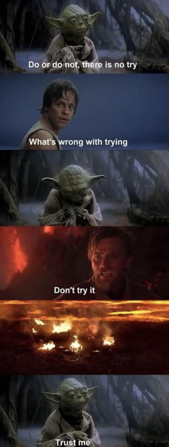 I always took it more as a sermon on defeatism and belief in one’s own prowess. The quote can be misleading out of context. But if you remember the entire scene, Luke is in a very negative mood. Saying over and over that he can’t lift the X-wing, that it is impossible, what is the point, it is different from lifting small rocks, etc. Yoda is trying to shift Luke’s point of view. There’s no difference between the small feat and the large feat, only that he doesn’t believe himself capable enough to do it. Yoda instead appeals to determination. Do it, failure is not even believing in doing it in the first place—remember the quote is not “success or fail”, it is “do or do not”. Lack of confidence and faith in the force is what is holding Luke back. The quote comes as a response for Luke going “ok, I’ll try” in a completely defeated way. Suggesting he already decided he will fail. Thus Yoda’s scolding, no, don’t try, do it, full send, believe. The unspoken corollary being, if you do it and fail, then just do it again, harder and using what you learned.