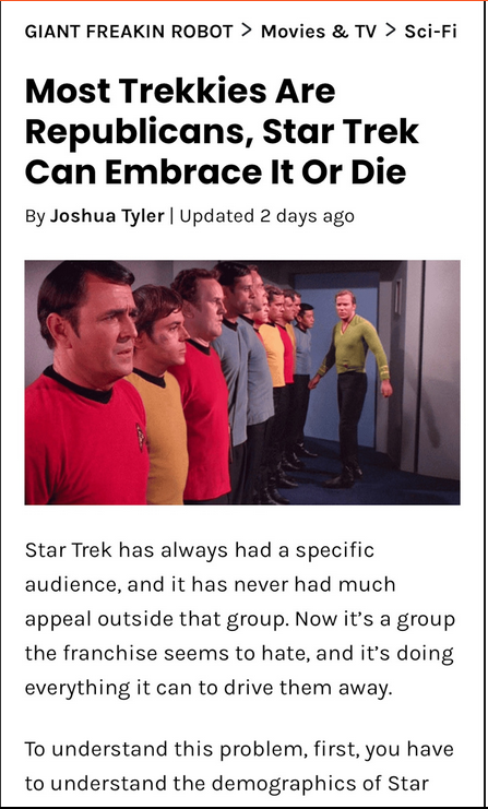 Well the reasoning in the article has nothing to do with the audience being conservative. It’s: Star Trek has a mainly male audience. Males are conservative. Then they show some picture how males went more conservative some 50 years(!) after it aired… I’m speechless. Maybe AI “reasoning”. Or just very, very stupid.