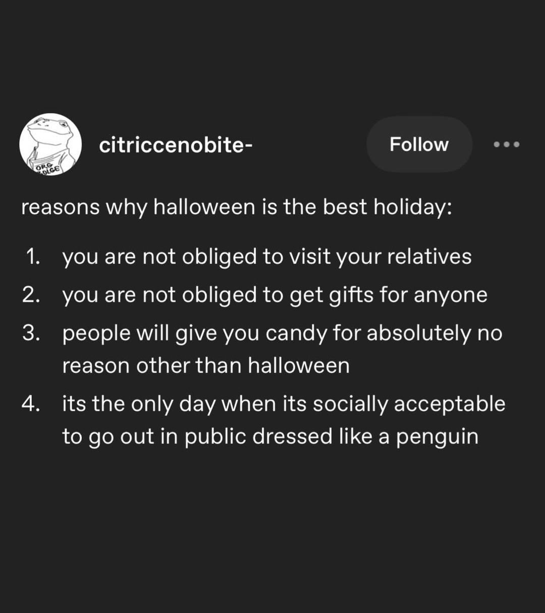 Good points, but I really do like Thanksgiving best. I have good relatives who I like hanging out with, and it’s just doing that and eating food (though I usually do an awful lot of cooking).