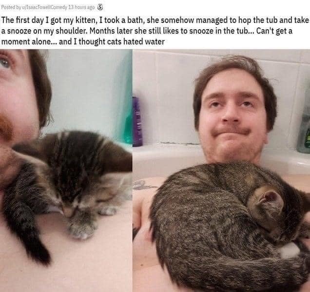 Cat learnt human bath time meant cat sleeping on the shoulder time, cat will sleep on the shoulder every time the human takes a bath, water or not, because that’s how reality works now in her world.