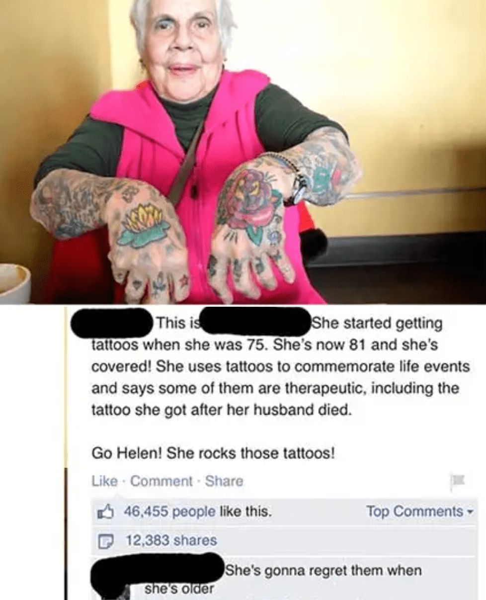 Hard to say what country she is from or lives in now, but tattoos gained a lot of popularity globally during WW2. If you were to go into a retirement home like 20 years ago, tattoos would probably be considered scandalous scars from a shady past. But today they are pretty common.
