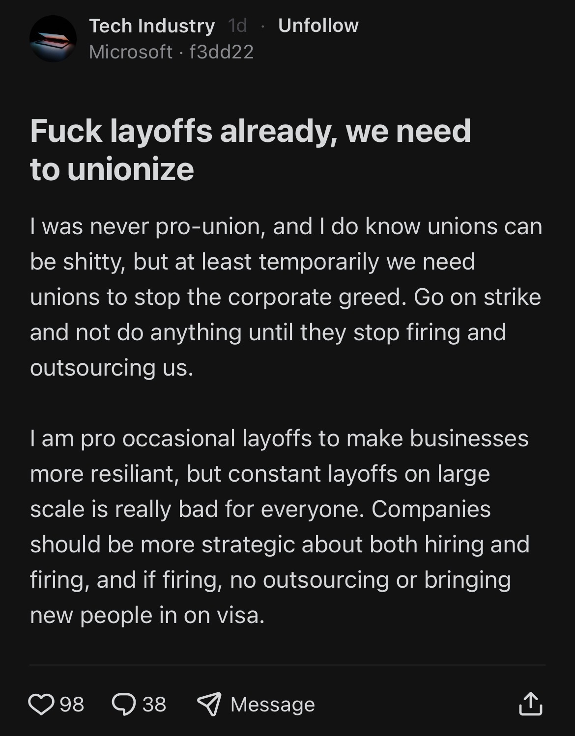 My favourite part about this is that IT is quite literally the worst market when it comes to unionisation in America since corpos will move the operation overseas within a week with zero pushback. IT employees let this happen without any sort of opposition because they were paid high for a decade or so.