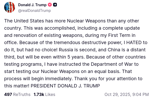 https://thehill.com/policy/defense/5580424-trump-directs-pentagon-to-start-testing-nuclear-weapons/